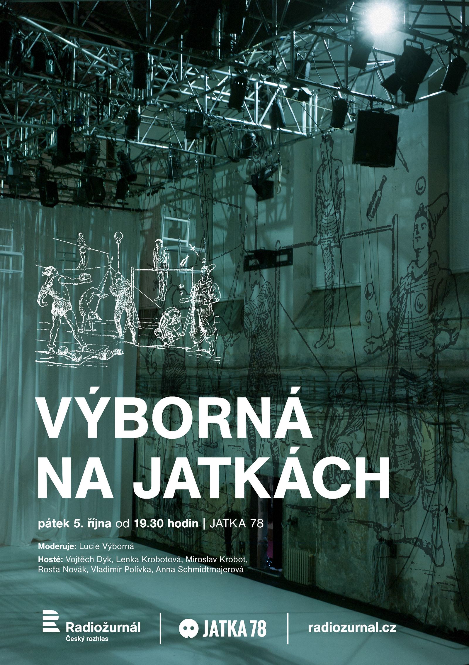 Posloucháte rozhovory Lucie Výborné? Ať už odpovíte jakkoli, tohle by vám nemělo ujít. Moderátorka totiž mimořádně vymění studio Radiožurnálu za sál Jatek78 a před zraky diváků vyzpovídá hned několik výjimečných hostů najednou. Nejen o herecké nebo akrobatické práci a představení Honey si ní budou povídat Lenka Krobotová, Anna Schmidtmajerová, Vojta Dyk, Miroslav Krobot, Rosťa Novák ml. a Vladimír Polívka.